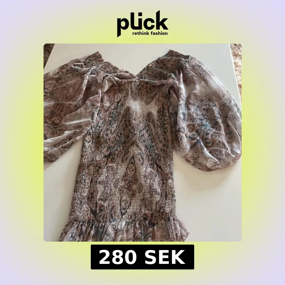Säljer en snygg offshoulder-klänning som är tajt , utsväng i slutet med ett unikt mönster i jordnära toner. Klänning har långa, puffiga ärmar och en smockad kropp som ger en fin passform. Perfekt för att ge en bohemisk touch till din outfit.