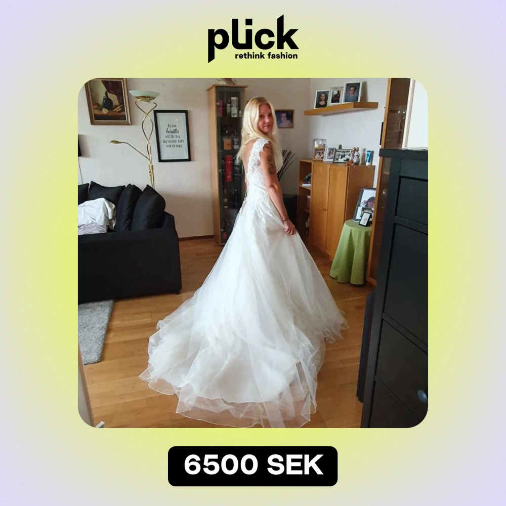 Underbar vit bröllopsklänning med vackra spetsdetaljer och en elegant öppen rygg. Klänningen har en lång, svepande kjol som ger en drömlik känsla. Perfekt för den stora dagen! 💍