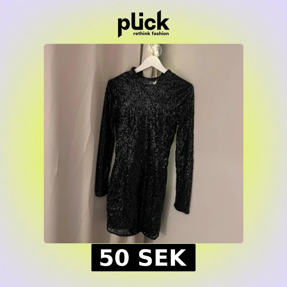 Snygg svart klänning med glittrande yta från Gina tricot. Den har en kort längd och långa ärmar, perfekt för en kväll ute. Klänningen är i ett stretchigt material.