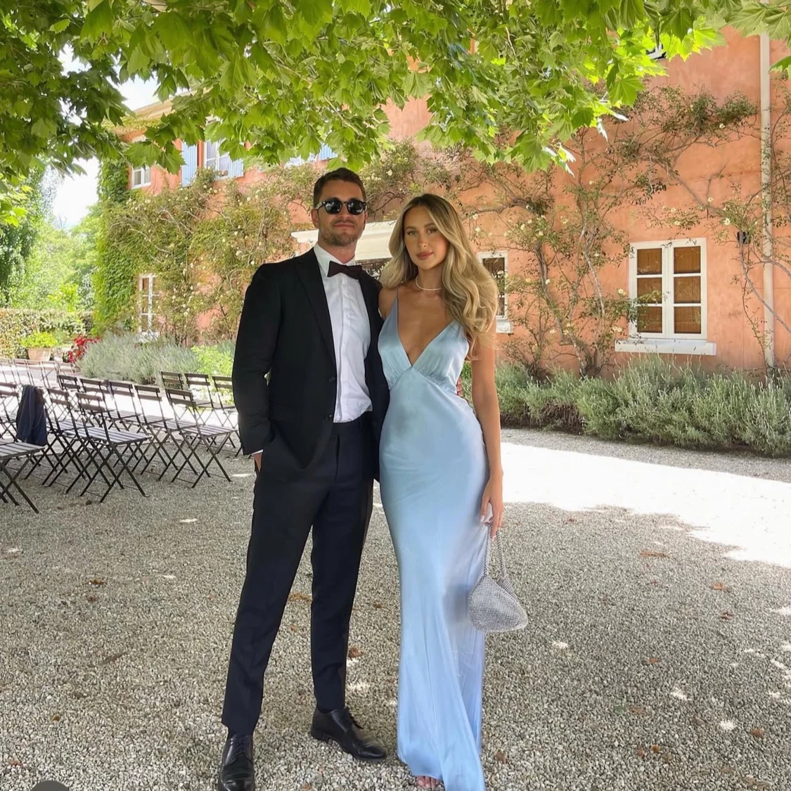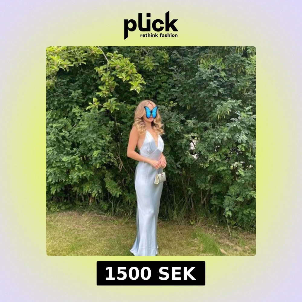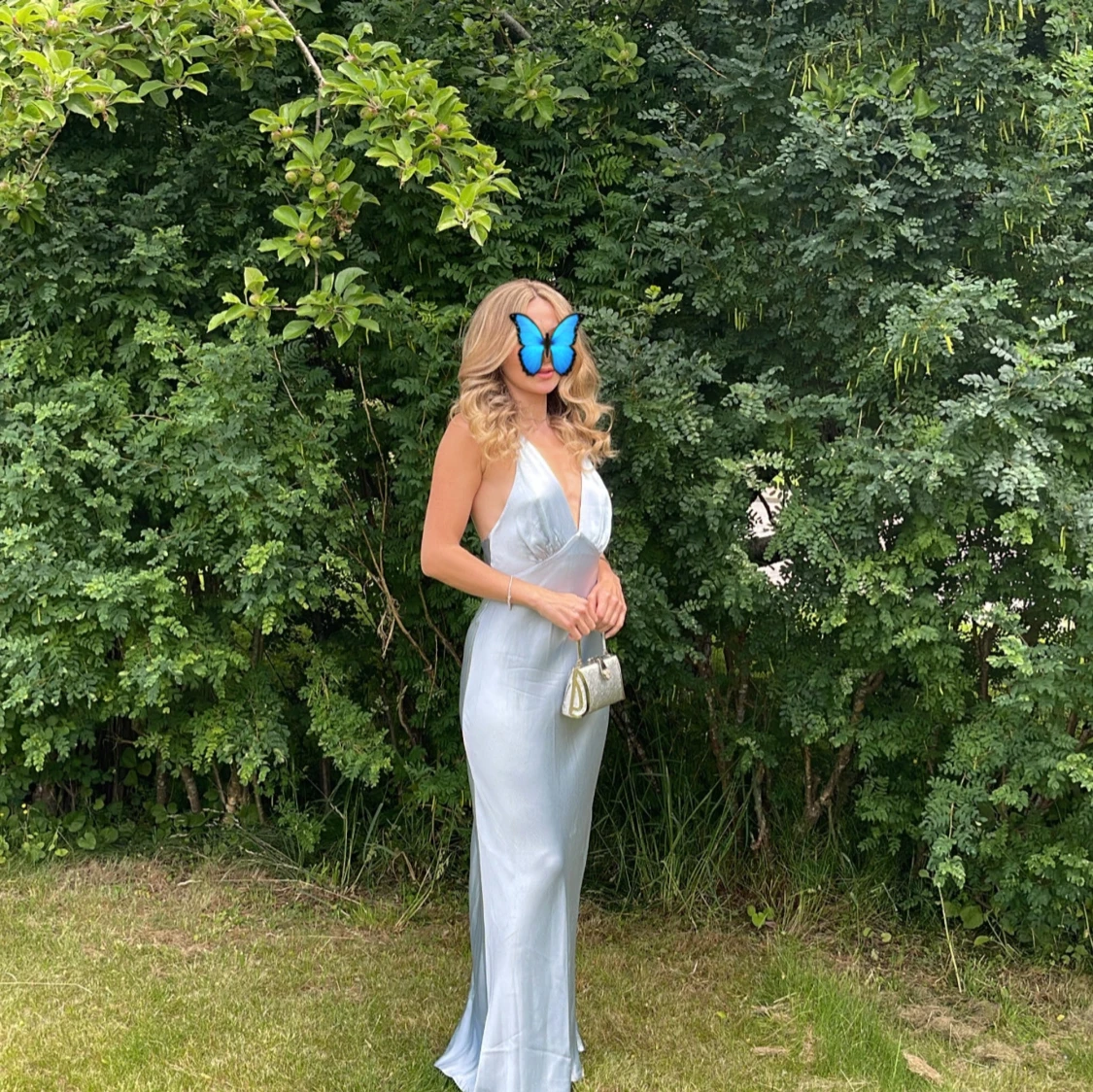 Elegant ljusblå långklänning i siden med djup v-ringning och smala axelband. Perfekt för sommarens festligheter.