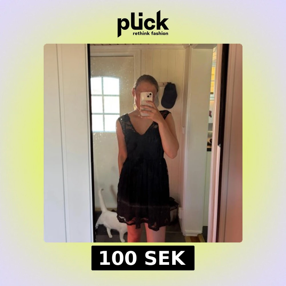 Säljer en svart kortklänning med v-ringning och spetsdetaljer både fram och bak. Klänningen är ärmlös och har en lätt utställd kjol. Perfekt för dig som vill ha en stilren och feminin look. Dragkedjan bak går ända upp