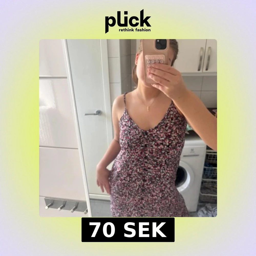 Säljer en söt blommig klänning med smala axelband och v-ringning. Klänningen har en svart bas med små rosa, vita och gröna blommor. Perfekt för varma dagar och har en lätt, luftig känsla.