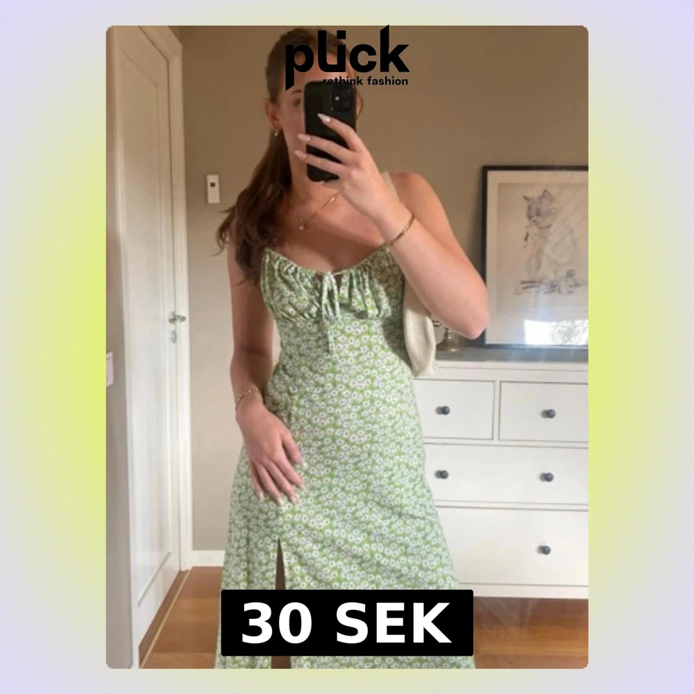 Superfin grön klänning med vita blommor, smala axelband och söt snörning framtill. Klänningen har en slits framtill och är perfekt för varma dagar. Materialet känns lätt och luftigt, och modellen är figurnära men ändå bekväm.