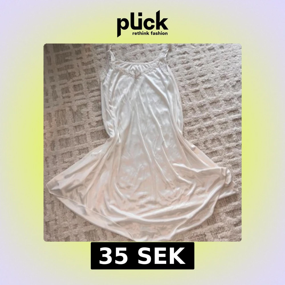 Säljer en elegant vit långklänning i satin med tunna axelband och vacker spetsdetalj vid halsringningen. Klänningen har en mjuk, glansig yta och faller snyggt längs kroppen. Perfekt för dig som gillar en romantisk och stilren look.