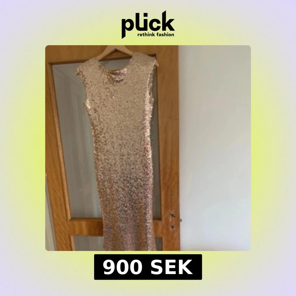 Säljer en maxad långklänning i champagnefärg med glittriga paljetter över hela klänningen. Den har ärmlös design, rund halsringning fram och djup v-ringning i ryggen. Perfekt för dig som vill sticka ut på festen!