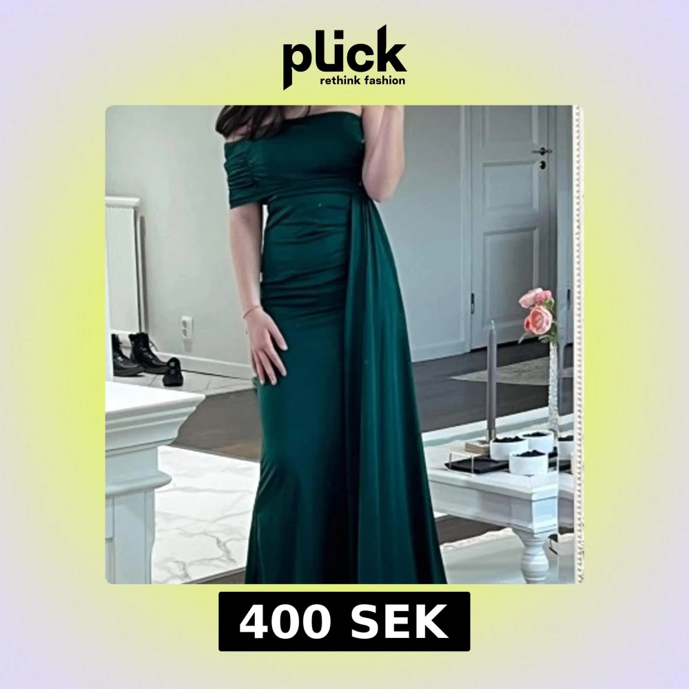 Säljer en elegant mörkgrön långklänning med offshoulder-design och draperad detalj över bysten. Klänningen har en figurnära passform upptill och ett långt, svepande fall. Perfekt för speciella tillfällen!Pris kan diskuteras