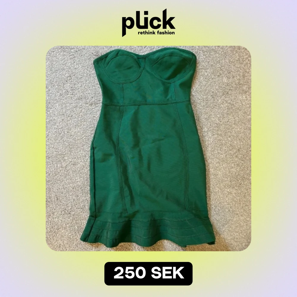 Snygg grön axelbandslös bandage klänning i tight passform. Perfekt för festliga tillfällen med sin eleganta design och volangdetalj vid fållen. Klänningen är i nyskick och har en smickrande siluett.