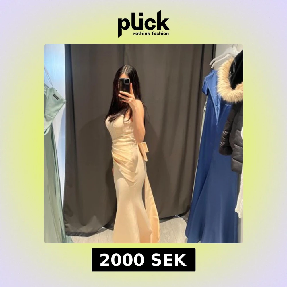 Säljer en elegant champagnefärgad långklänning med omlottdetalj och slits framtill. Klänningen har smickrande passform och markerad midja med knytband. Perfekt för bal eller fest. Köpt från Sasha butiken i Södertälje, Nypris 3800kr.