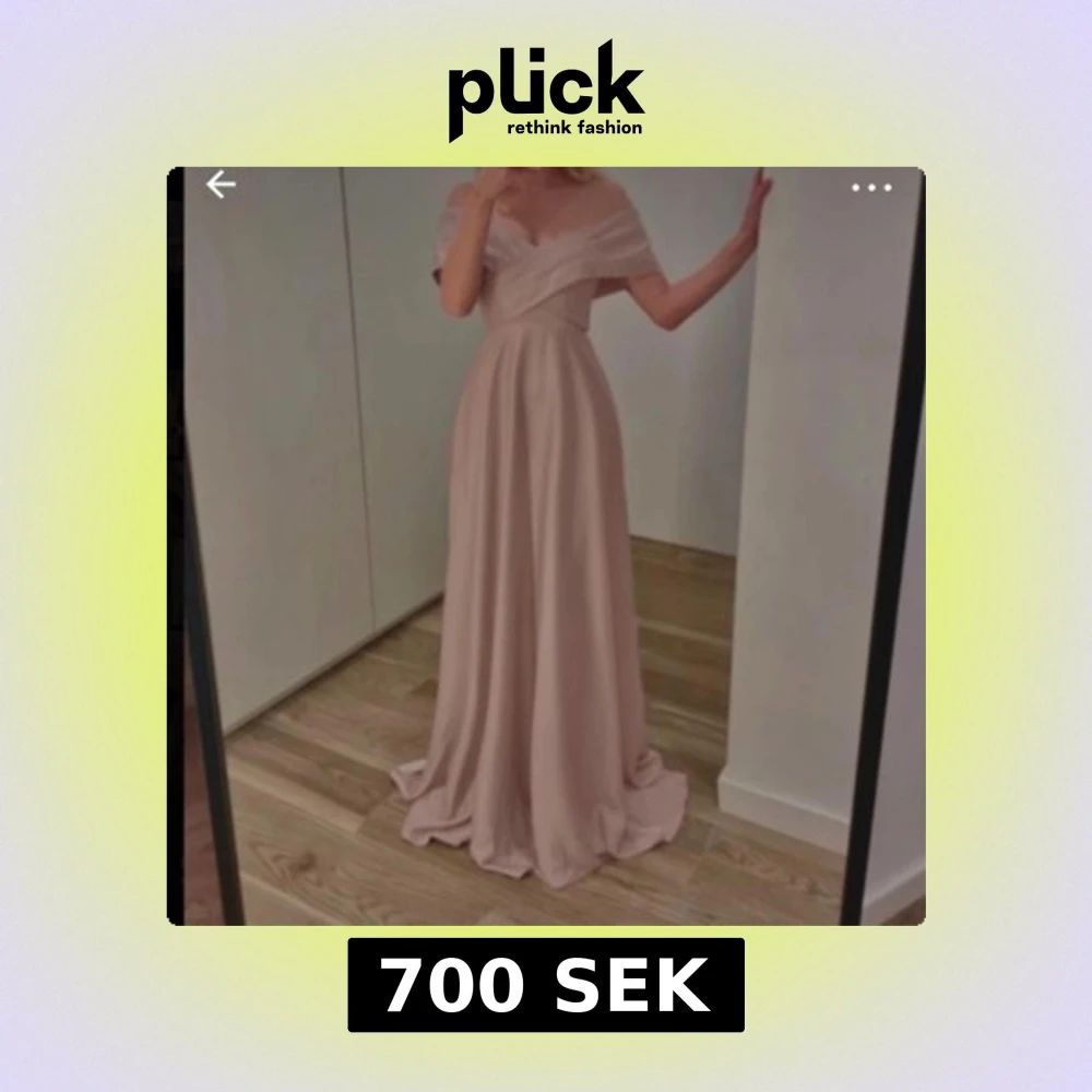 Elegant champagnefärgad långklänning med offshoulder-design och omlott-detaljer. Perfekt för festliga tillfällen. Inte använd, perfekt för dig som är lång.