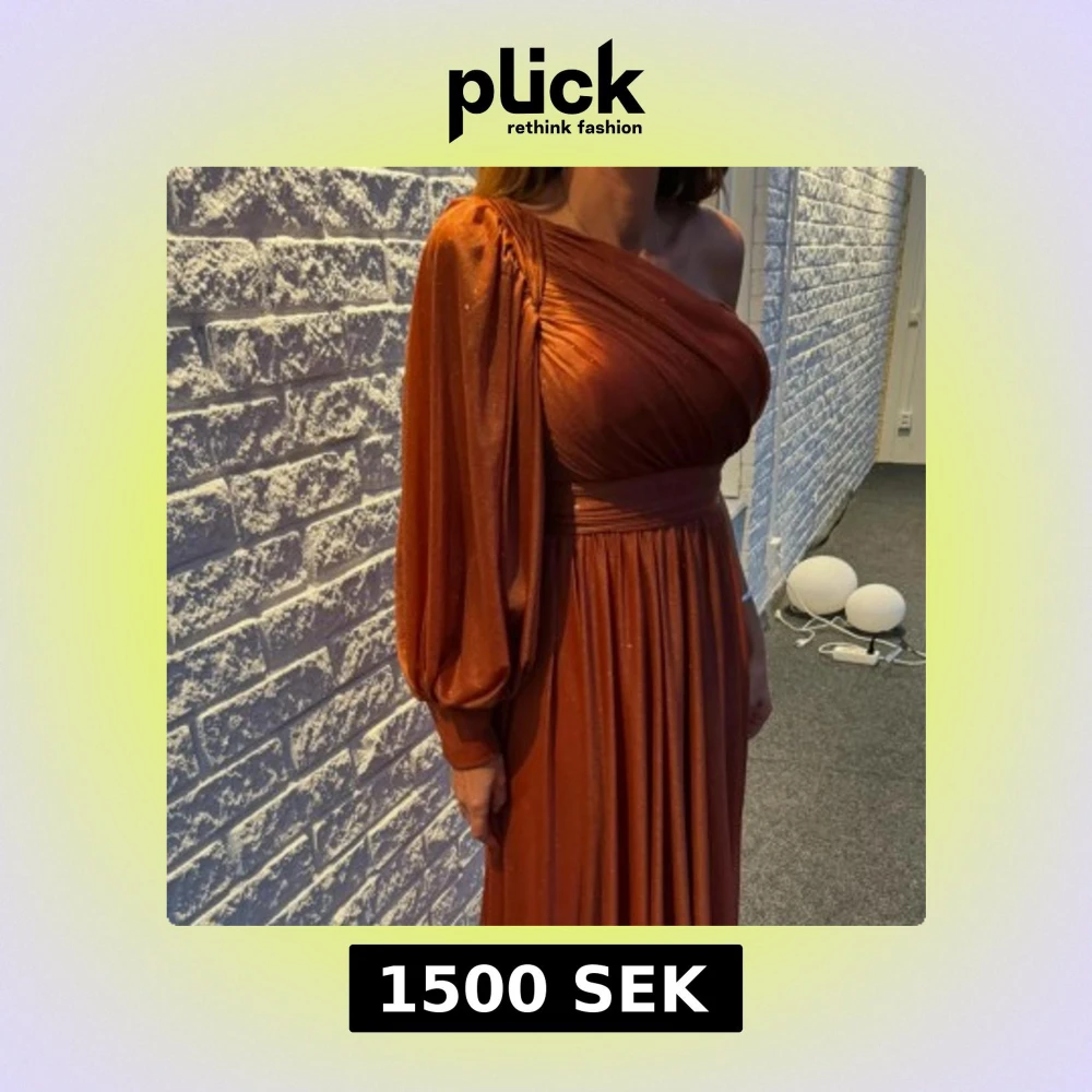 Säljer en elegant rostorange långklänning med glittrigt tyg och oneshoulder-design. Klänningen har en lång puffärm och markerad midja som ger en snygg siluett. Storlek 34/36 hör av dig för fler bilder