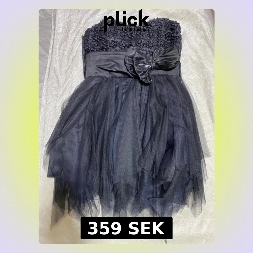 Supersnygg svart axelbandslös kortklänning med voluminös tyllkjol, dekorerad med stora blommor upptill och en stor rosett i midjan. Överdelen har 3D-blommor och kjolen är i flera lager mesh. Perfekt för dig som vill sticka ut på festen! Oanvänd Stlk XS-S