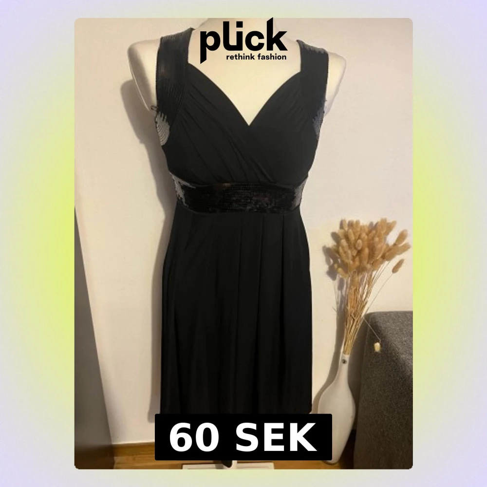 Snygg svart klänning med breda axelband och v-ringning. Klänningen har glittrande paljetter på axelbanden och i midjan, vilket ger en festlig touch. Materialet är mjukt och faller fint. Perfekt för dig som vill sticka ut med lite extra bling.några paljetter har lossnat