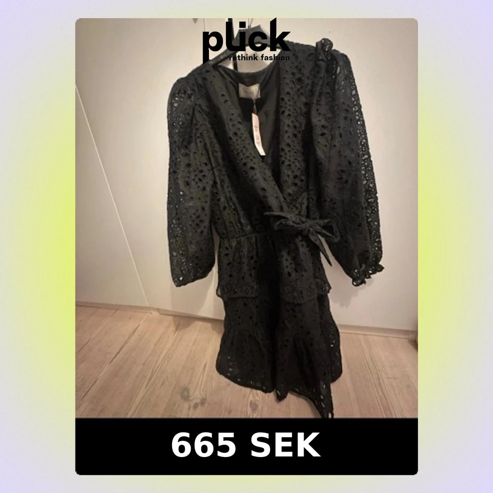 Säljer en svart långklänning från Kelia (Nelly) i storlek 36. Klänningen har v-ringad omlottfront, långa ärmar och är dekorerad med broderad spets och hålmönster. Midjan markeras med ett knytband och kjolen har volangdetaljer. Passar perfekt till nyår eller annat firande, prislappen finns kvar. Nypris 899