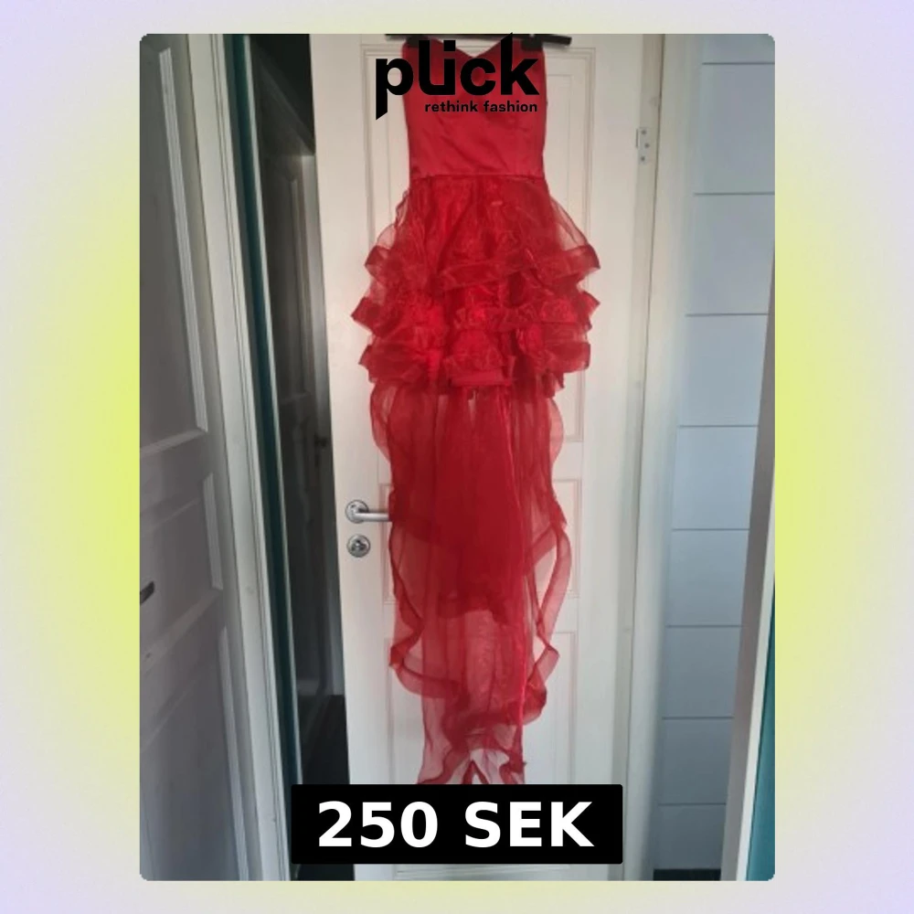 Snygg röd långklänning med volanger och transparent, asymmetrisk kjol. Klänningen är axelbandslös och har snörning i ryggen för en justerbar passform. Perfekt för dig som vill sticka ut med en dramatisk look. Har en liten repa i botten av klänningen som man kan se på sista bilden. Köpte den begagnad men har kvar prislappen från erikshjälpen är kvar, aldrig använd av mig.