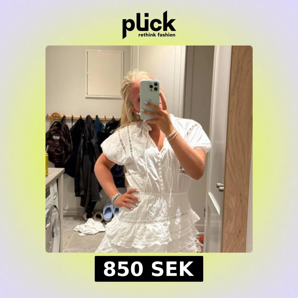 Supersöt vit kort klänning från Maje med volanger och spetsdetaljer. Klänningen har korta ärmar, v-ringning med knappar framtill och markerad midja. Använd endast på konfirmationen köpt för 2500 kr från maje. Storlek 36.