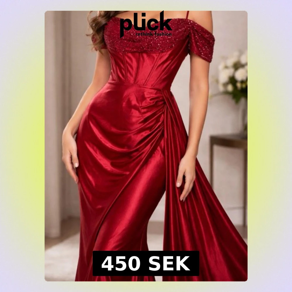 Elegant röd långklänning med smala axelband och glittrig paljettdekor över bysten. Klänningen har en draperad detalj på sidan och är tillverkad i ett glänsande satinliknande material. Perfekt för dig som vill sticka ut och känna dig extra glamorös.