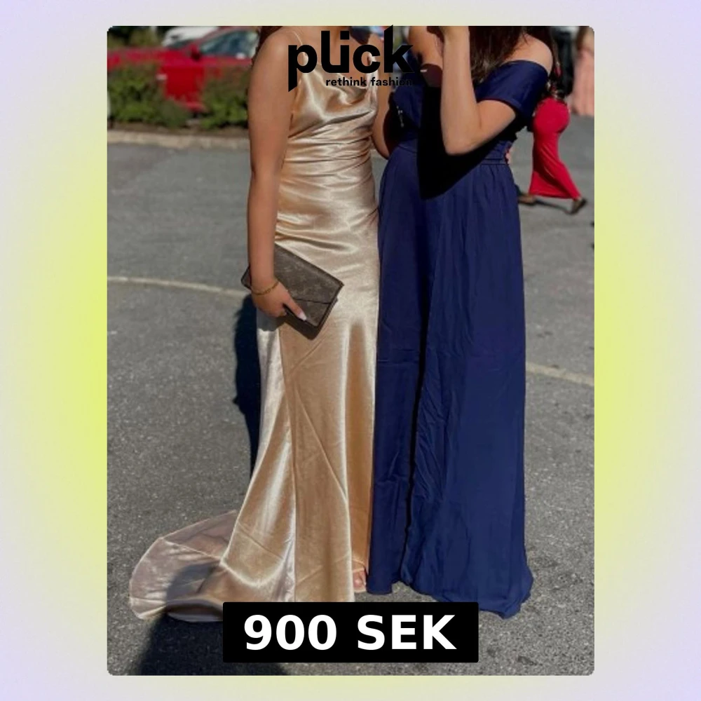 Elegant långklänning i champagnefärgad satin med smala axelband och draperad urringning. Klänningen har en hög slits framtill och ett släp baktill för extra effekt. Perfekt för bal eller festliga tillfällen. Storlek 36. Köpt för 1500kr från zalando. Haft på mig den en gång