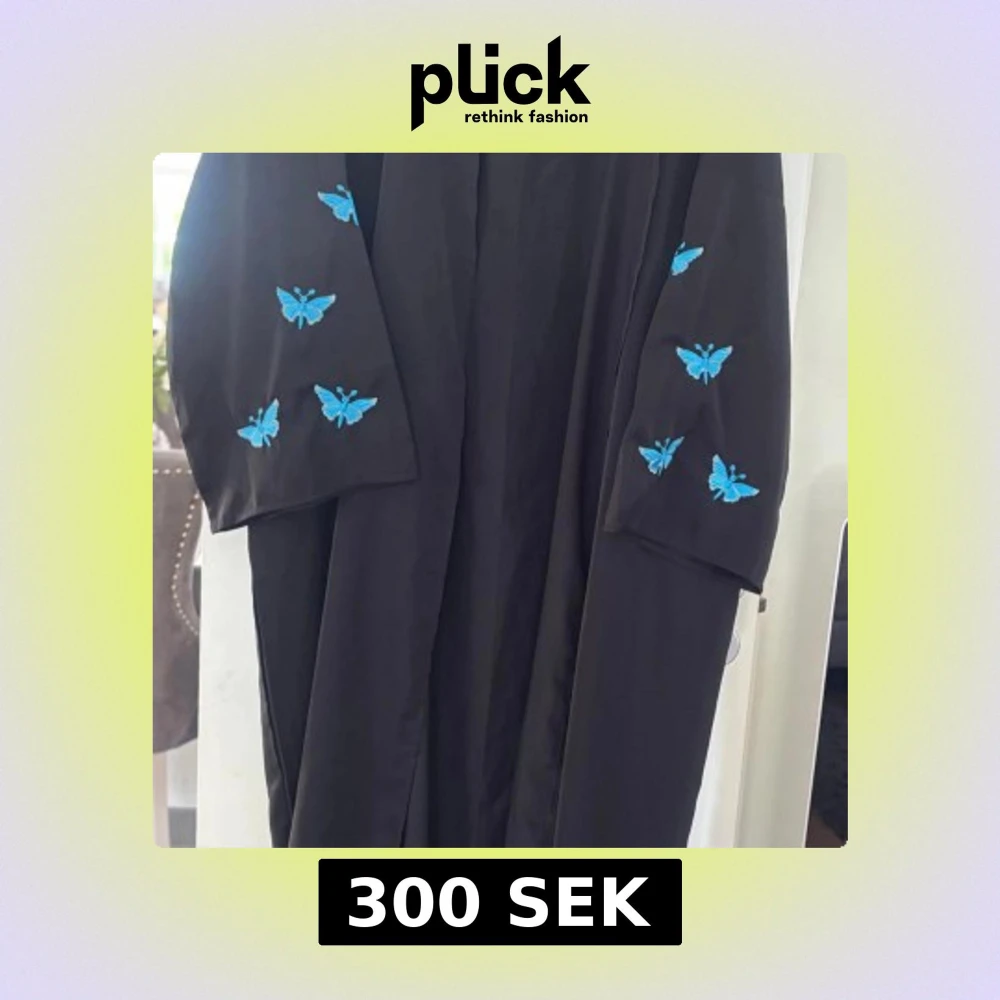 Två stycken helt oanvända svarta långklänningar med vida ärmar och broderade fjärilar i blått och rosa på ärmarna. Klänningen har en loose passform och är tillverkad i ett lätt, flowy material. Perfekt för dig som vill sticka ut med coola detaljer och färgglada broderier. Styck 170 kr. Klänningarna är Onesize där de passar ifrån storlek 36-46
