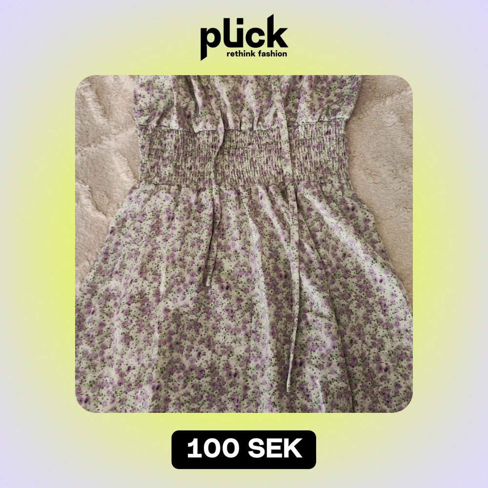 Söt blommig klänning i ljusa toner med lila och gröna blommor. Den har en smockad midja för en bekväm passform och volangdetaljer vid axlarna. Perfekt för sommarens alla tillfällen!