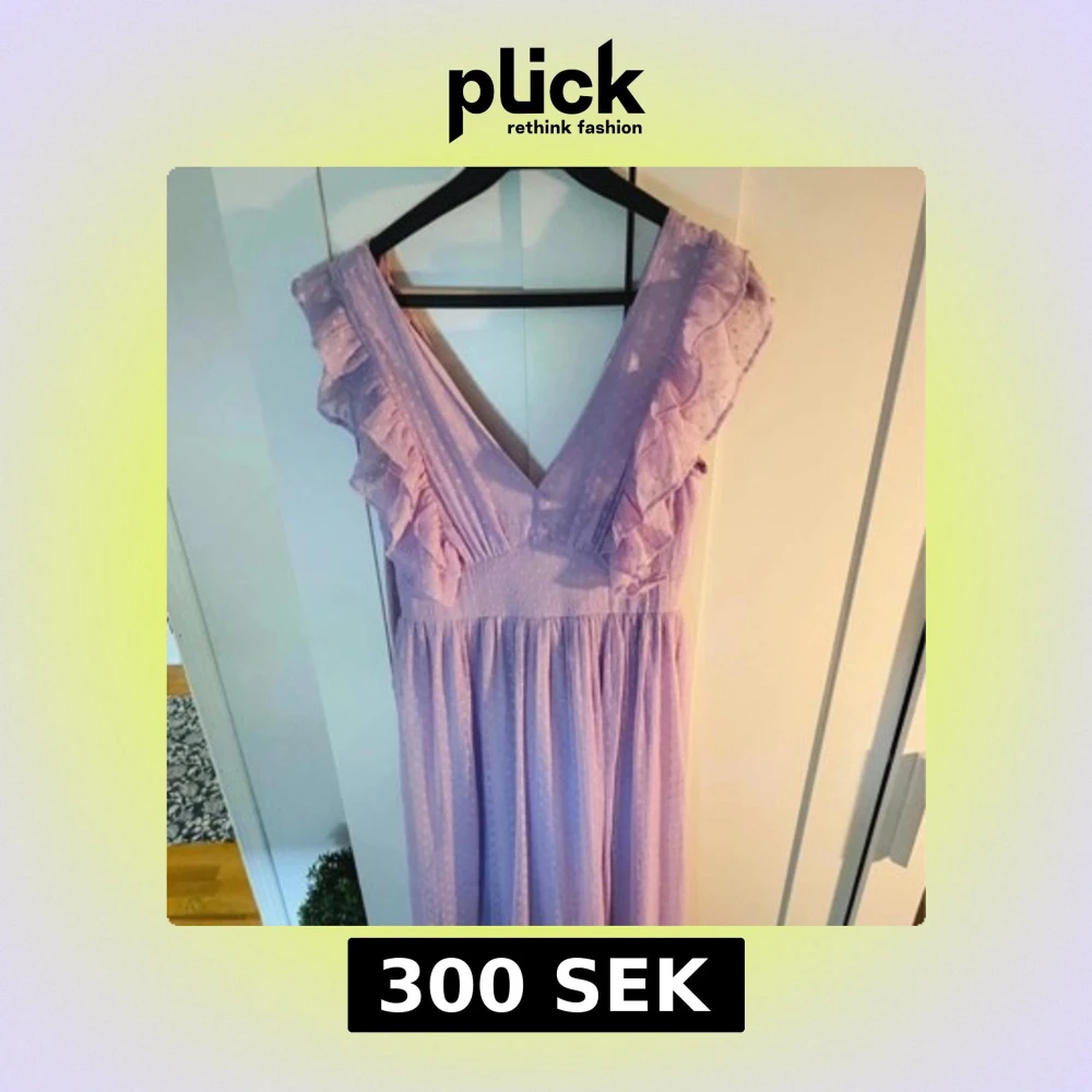 Superfin ljuslila långklänning med djup v-ringning och volangdetaljer längs axlarna. Klänningen har knyt i nacken och ett lätt, luftigt tyg med diskret prickigt mönster. Perfekt för sommarens tillfällen!