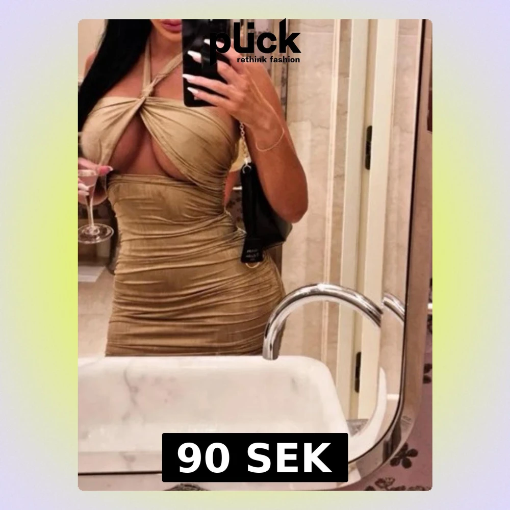 Säljer en champagnefärgad kortklänning med omlottdetalj och snörning i halsen. Klänningen har en tight passform, är ärmlös och har en snygg rynkad effekt längs sidorna. Perfekt för dig som vill sticka ut med en unik och trendig look.