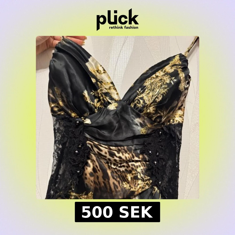 Elegant långklänning med leopardmönster och svarta spetsdetaljer på sidan upptill. Klänningen har smala axelband och en v-ringad design med slits. Storlek 36/38 S/M använd en gång. Pris kan diskuteras och skriv privat för fler bilder