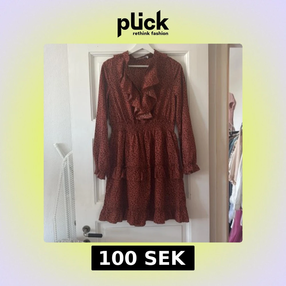 Säljer en rödbrun klänning med svarta prickar och volangdetaljer vid halsringningen. Klänningen har lång ärm, markerad midja och lätt utställd kjol. Perfekt för dig som gillar feminina detaljer och mönster.