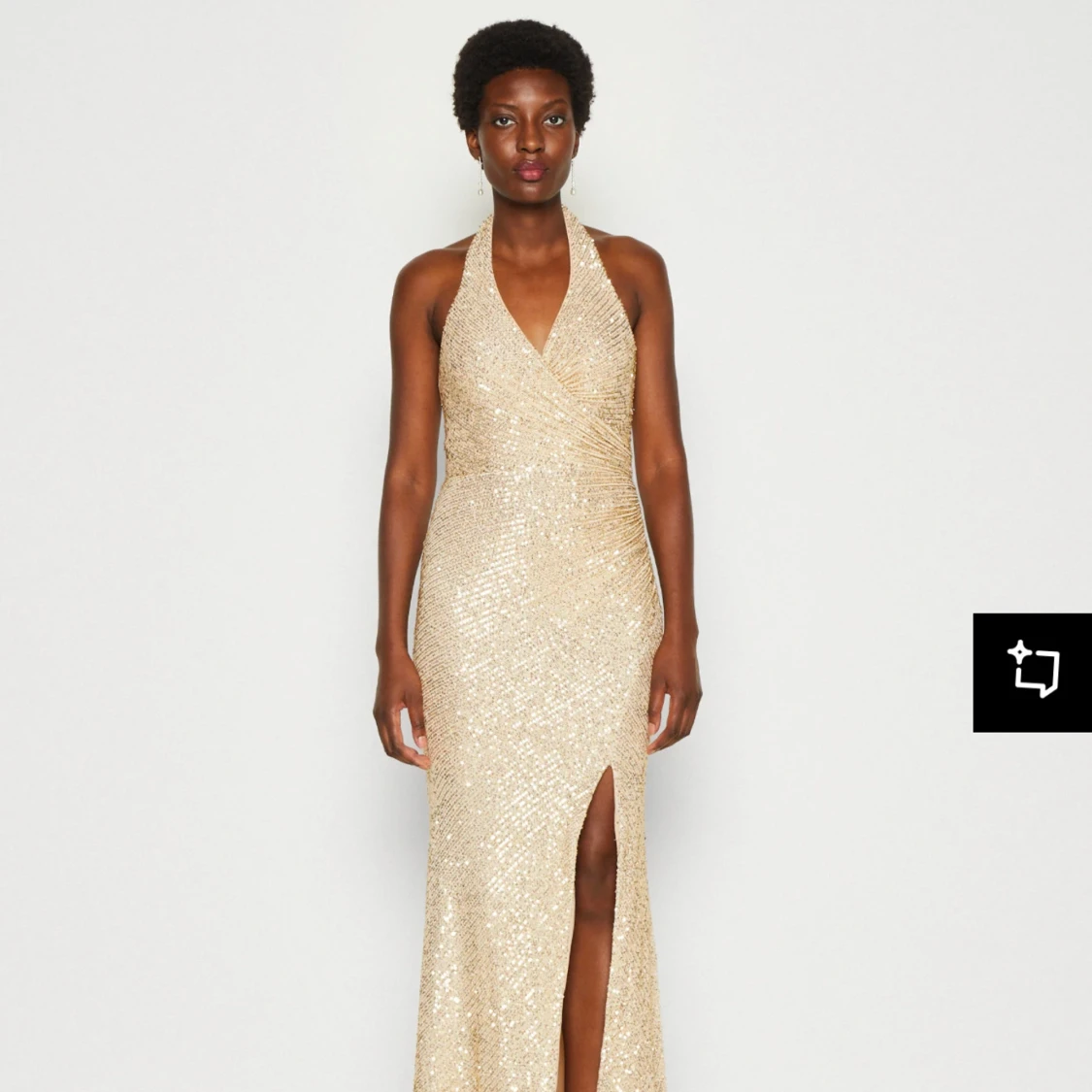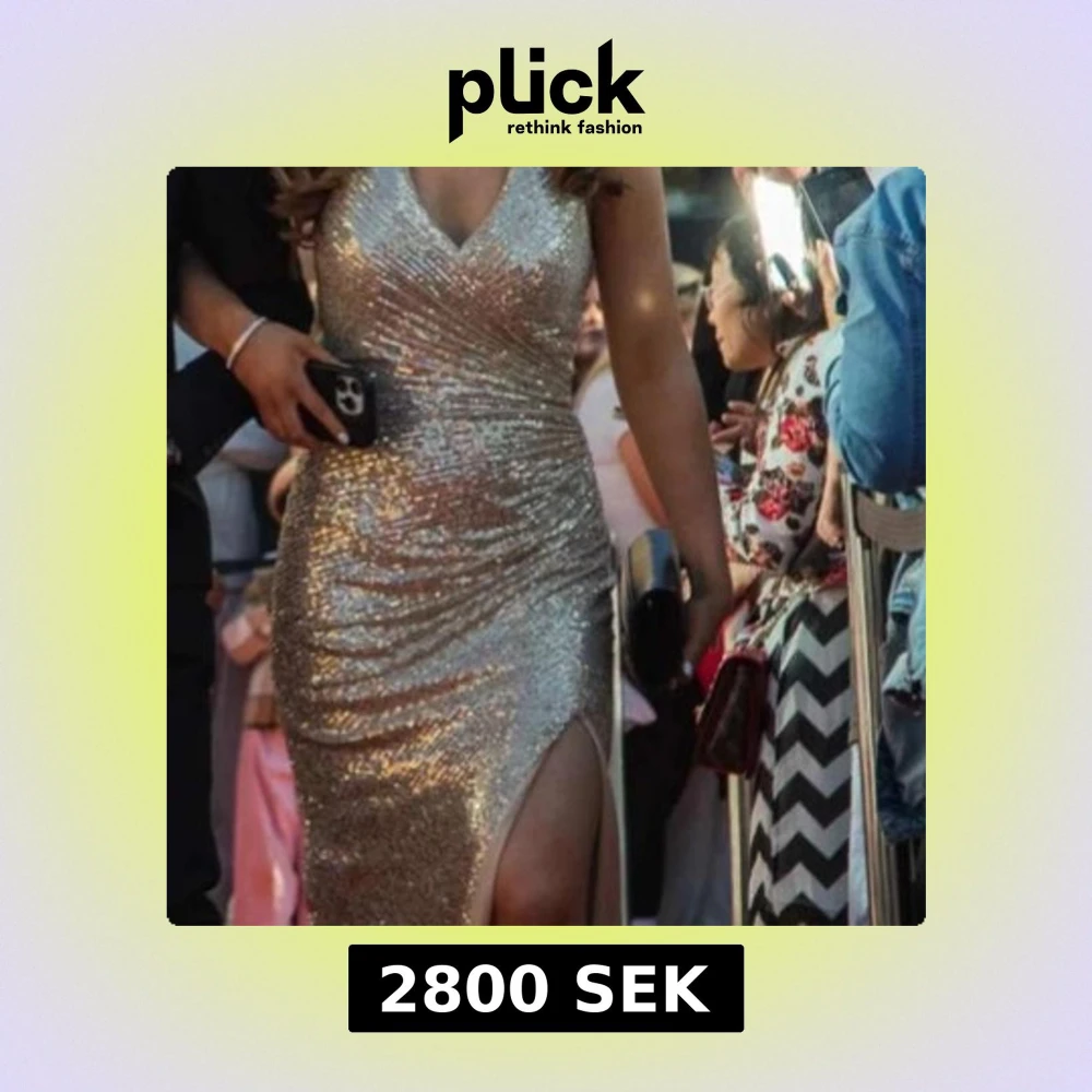 Säljer en maxad långklänning i guld med glittriga paljetter, omlott över bysten och djup v-ringning. Klänningen har en snygg slits framtill och är ärmlös med halterneck. Perfekt för dig som vill sticka ut på bal eller fest!