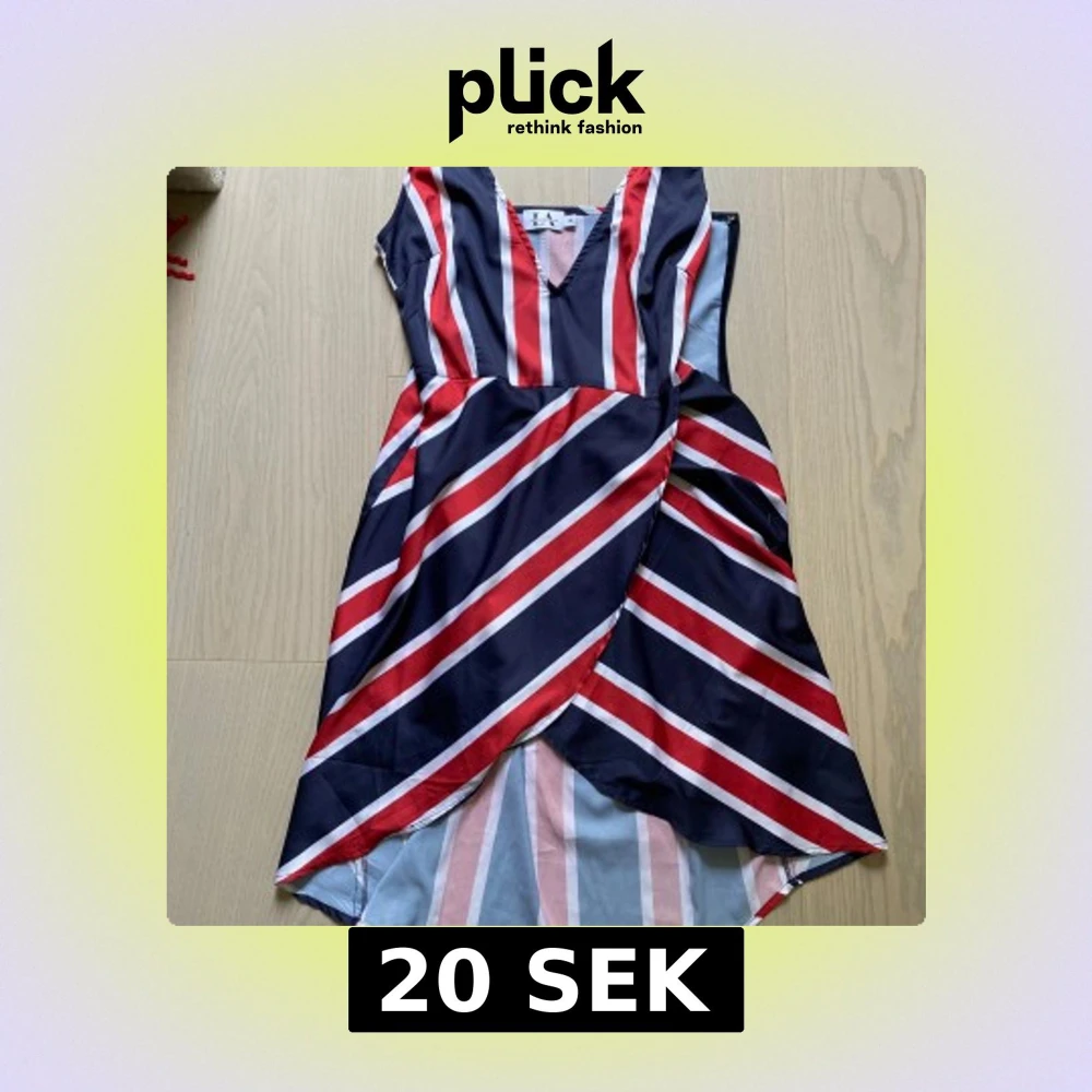 Superfin kortklänning med v-ringning från Linn Ahlborg x NA-KD. Klänningen har ett randigt mönster i marinblått, rött och vitt, omlott framtill och är ärmlös. Perfekt för dig som gillar färg och vill sticka ut lite extra.