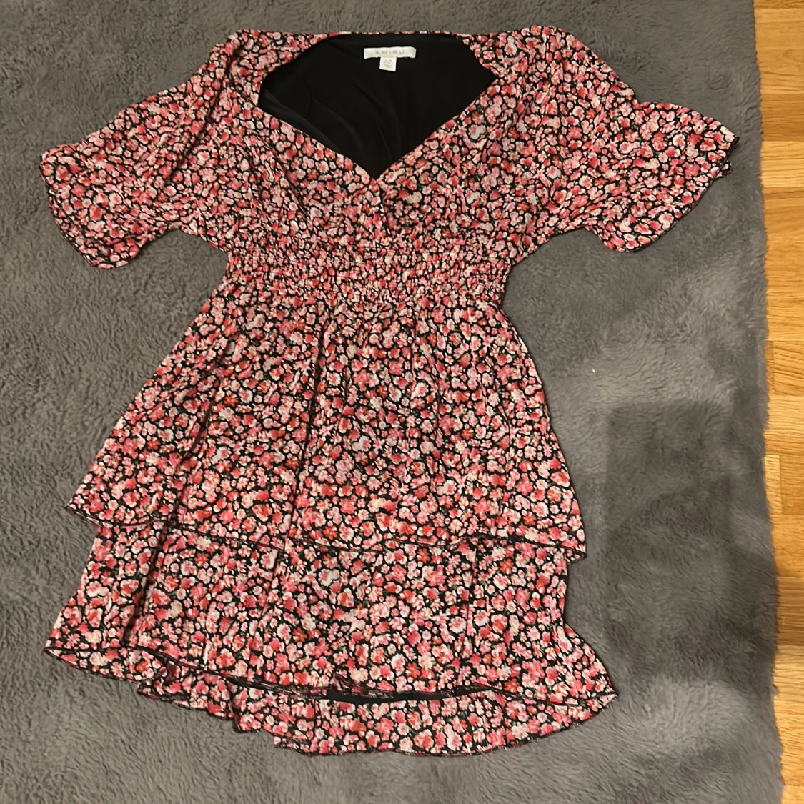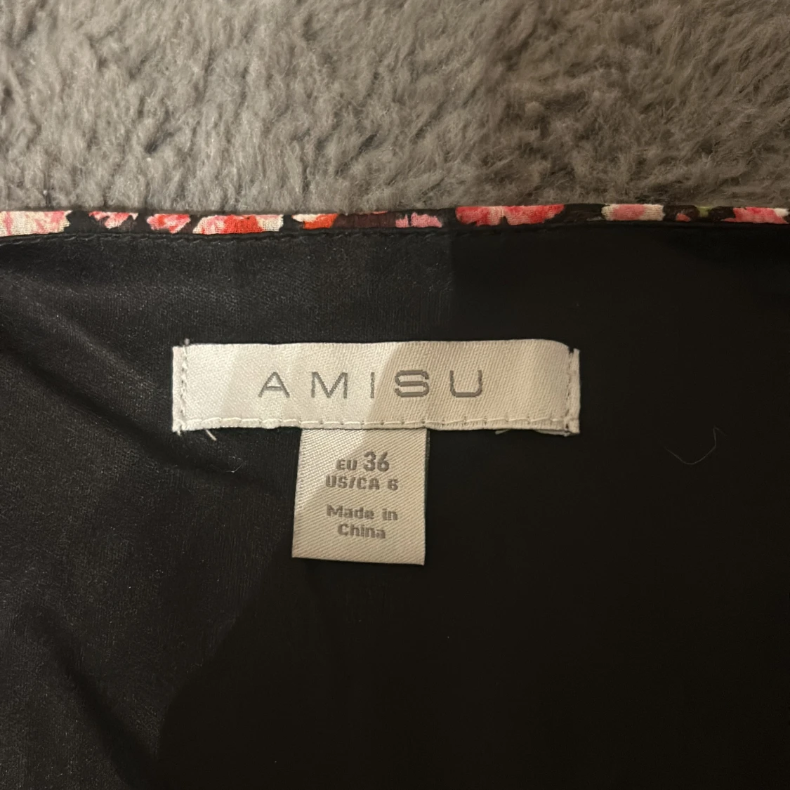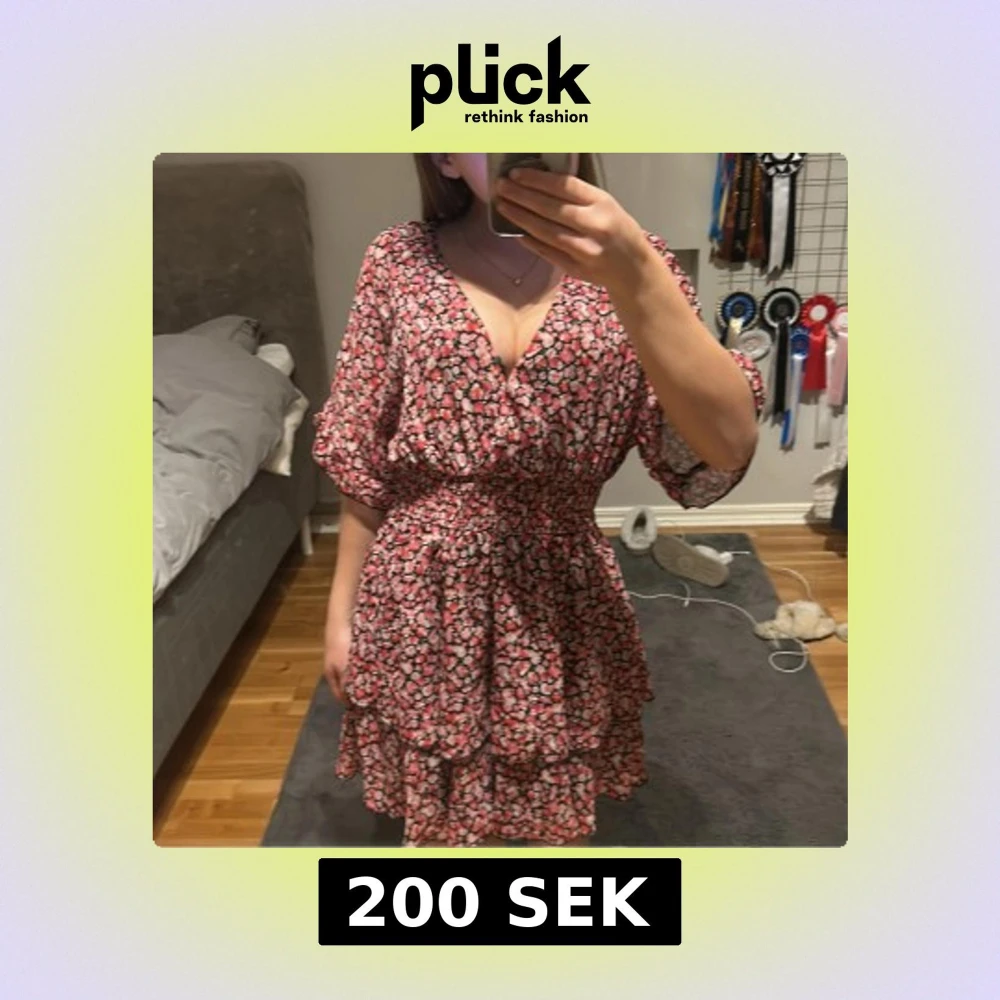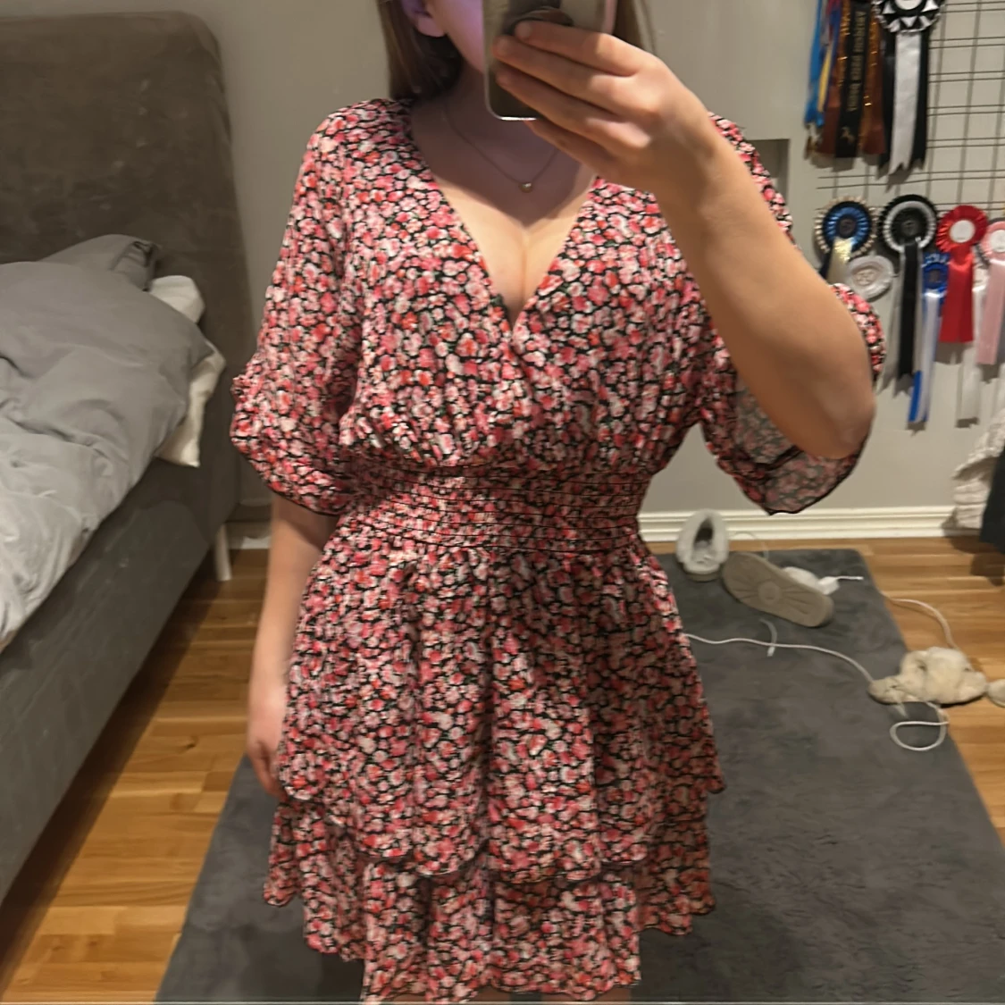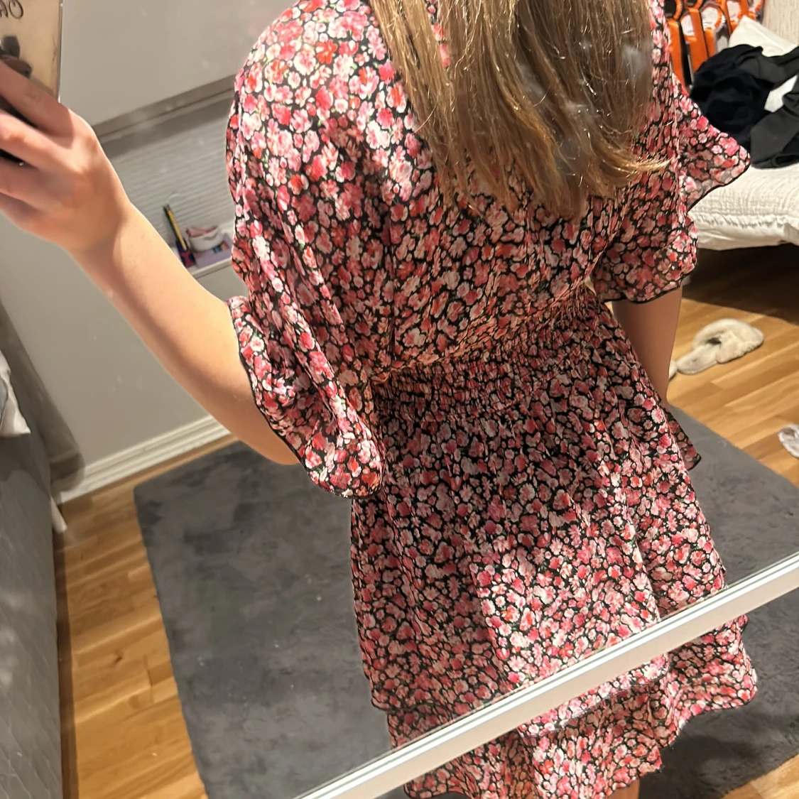 Säljer en söt blommig klänning från Amisu i storlek 36. Klänningen har en v-ringad design med korta ärmar och volanger. Den är perfekt för sommarens alla tillfällen med sitt färgglada mönster i rosa och svart.
