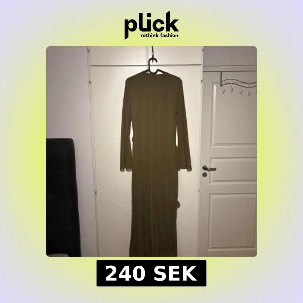 Säljer en olivgrön långklänning med långa ärmar och rund halsringning. Klänningen har flera diagonala volangdetaljer framtill som ger en cool och trendig look. Materialet är tunt och faller snyggt längs kroppen. Perfekt för dig som gillar unika detaljer och stilren design. PRIS KAN ALLTID DISKUTERAS!!