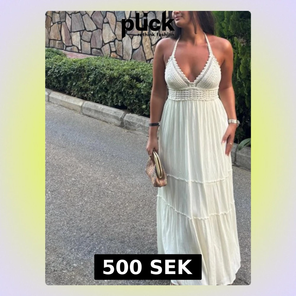 Superfin långklänning i vitt med virkad halterneck. Klänningen har djup v-ringning och tunna axelband som knyts i nacken. Nyskick och har prislapp på. Endast testad.