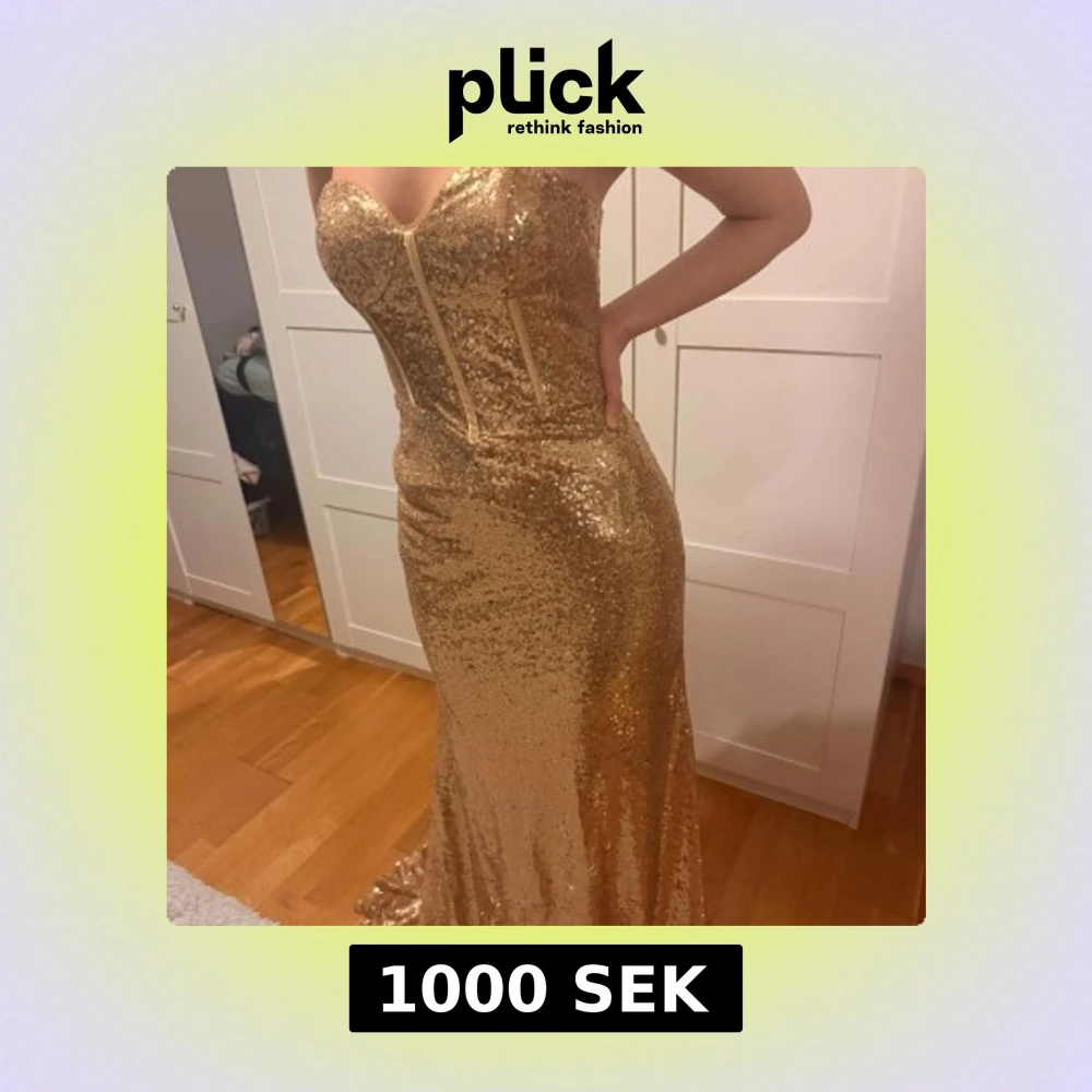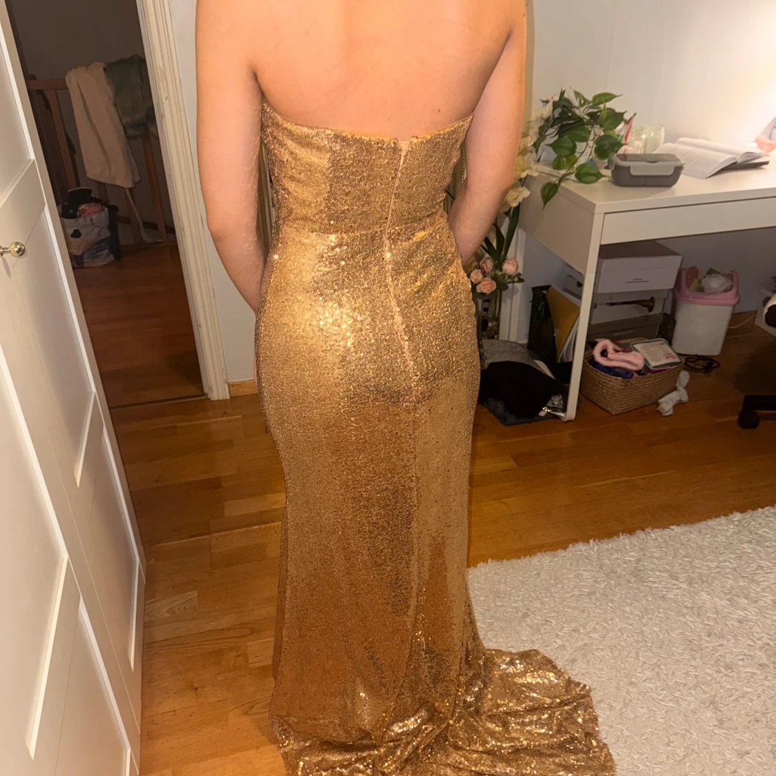 Säljer en superglammig guldig långklänning med paljetter över hela tyget. Klänningen är axelbandslös, figurnära och har en snygg släp. Perfekt för dig som vill sticka ut och glänsa på bal eller fest. Dragkedja i ryggen för enkel påklädning.