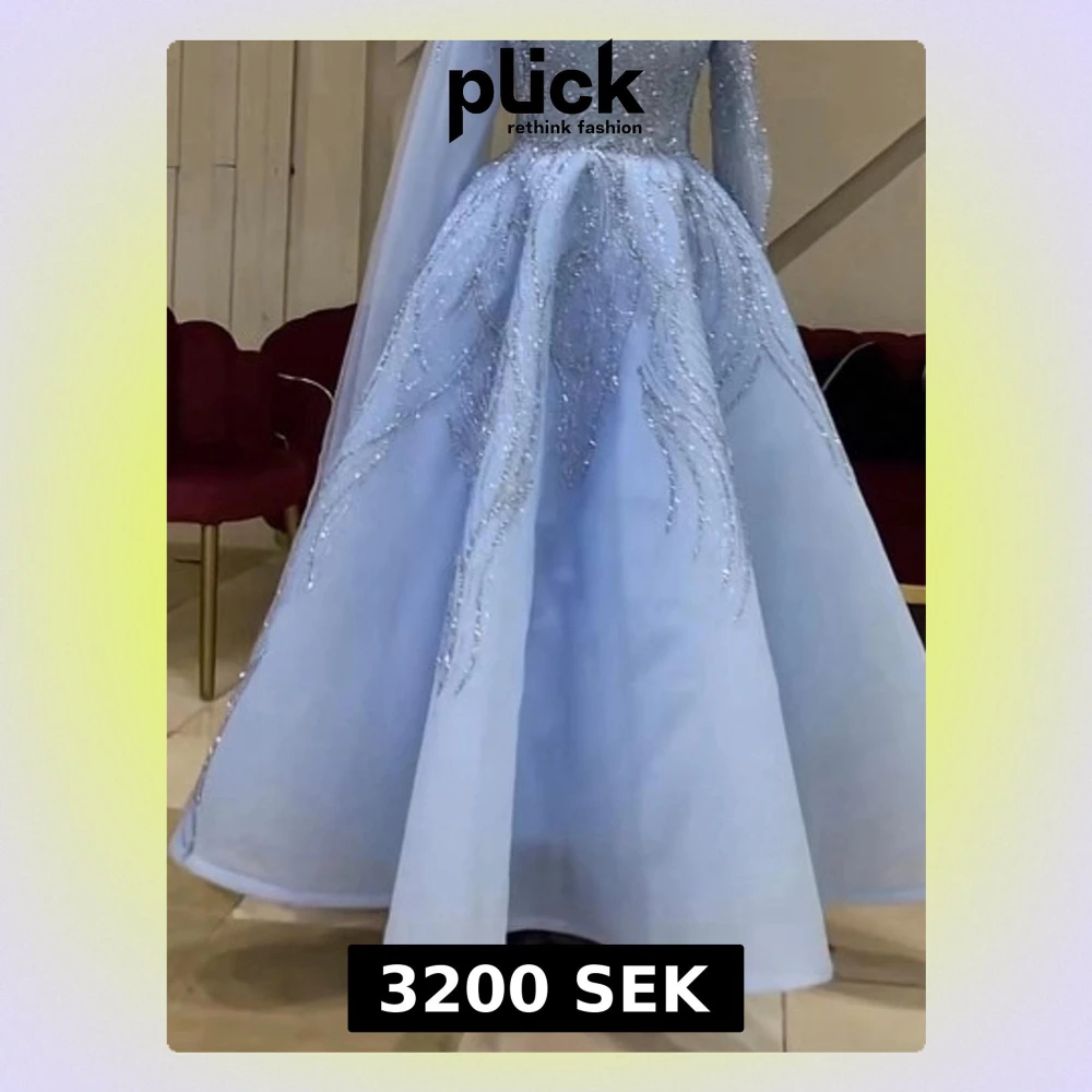 Magisk ljusblå långklänning med glittriga detaljer och långärmad design. Klänningen har en vid kjol och vackra paljettmönster över livet och kjolen som ger en sagolik känsla. Perfekt för speciella tillfällen där du vill glänsa extra.