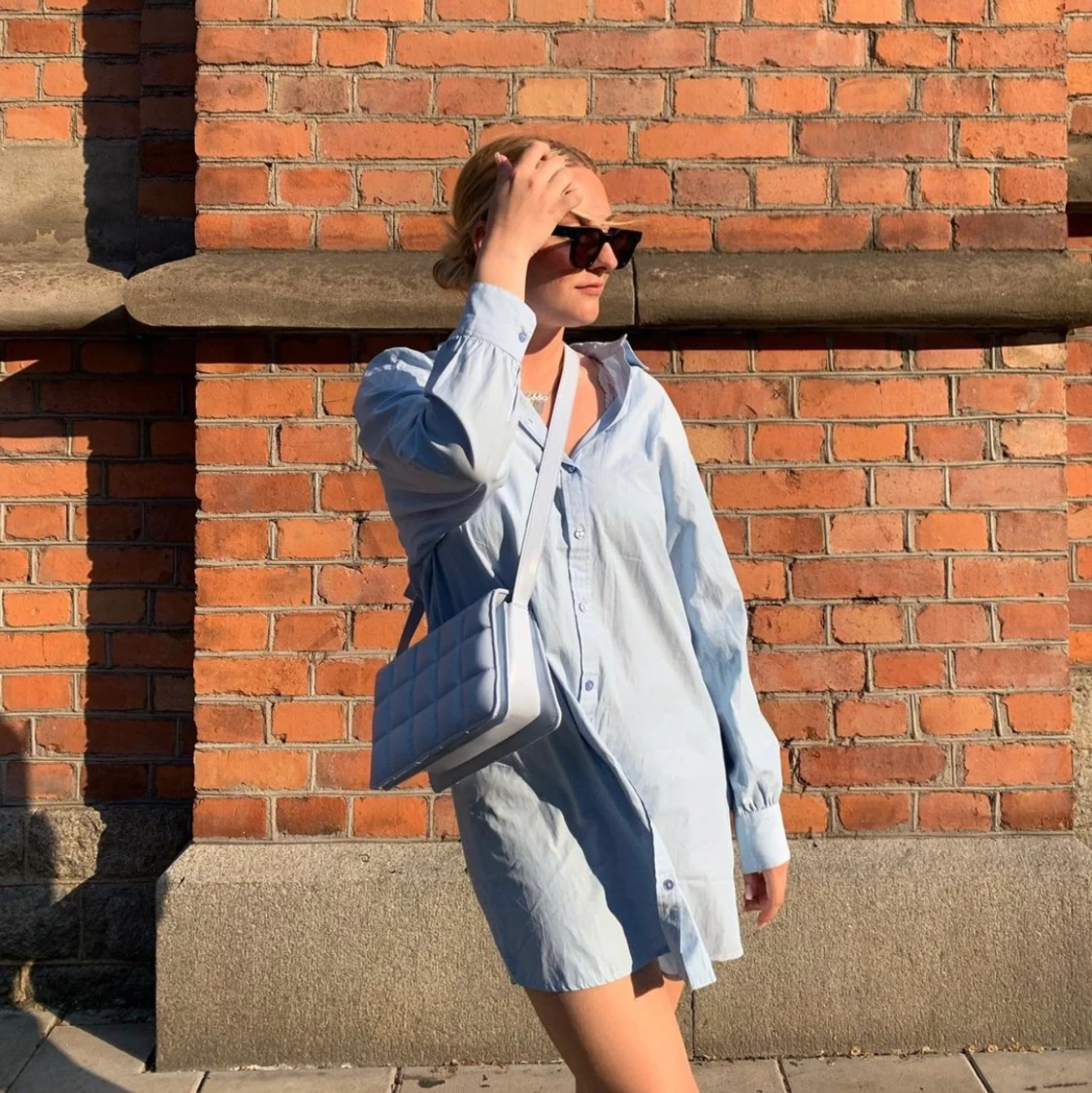 Oversized skjortklänning i ljusblå färg! Jättefin och luftig. Snyggt att ha med strumpbyxor. Storlek 36
