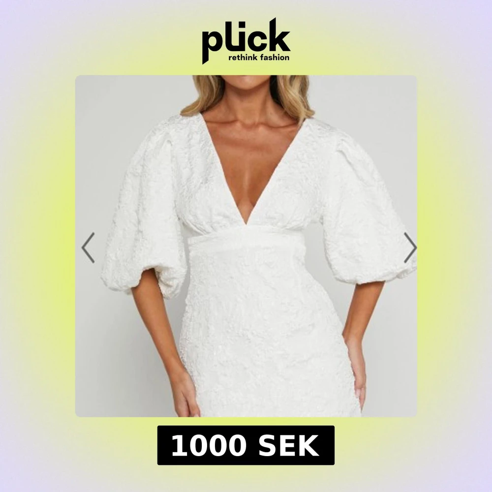 Elegant vit klänning med djup v-ringning och puffiga trekvartsärmar. Som är helt oanvänd med prislappen kvar. Passar perfekt till studenten! Köpt för 1250kr.