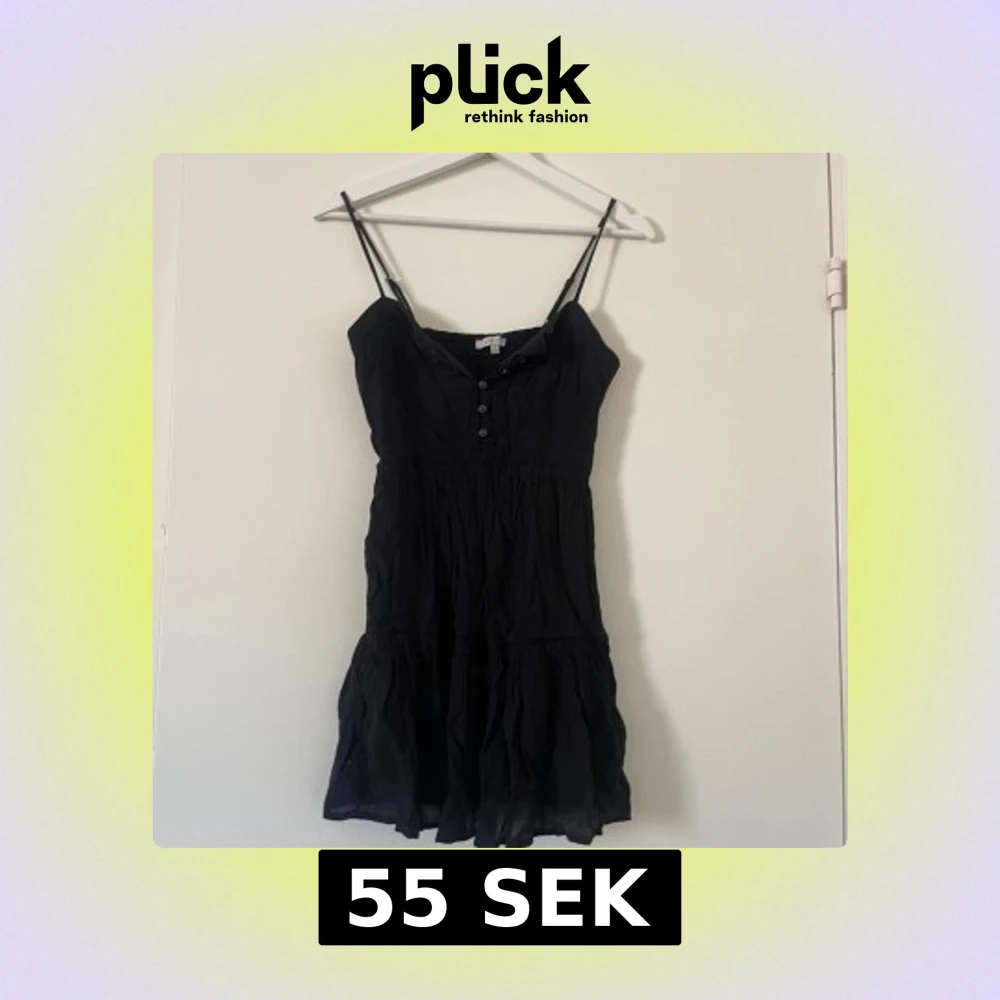 Snygg svart klänning med smala axelband och knappar framtill. Perfekt för varma dagar med sin lätta och luftiga design. Den har en volangdetalj vid fållen som ger en extra touch av stil.