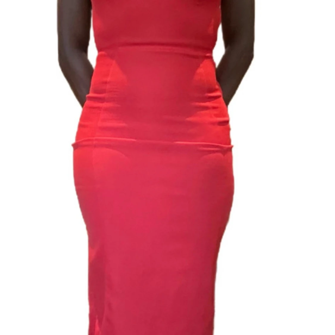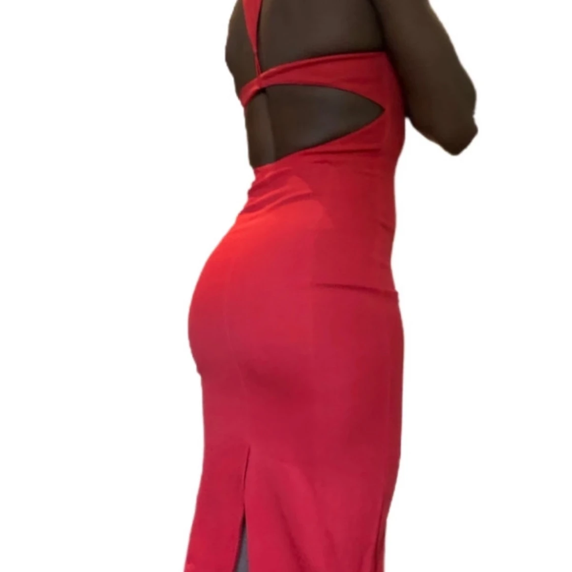 Snygg röd klänning med tight passform och öppen rygg. Klänningen har en slits baktill och är ärmlös, vilket ger en elegant look. Perfekt för en kväll ute eller en speciell tillställning.