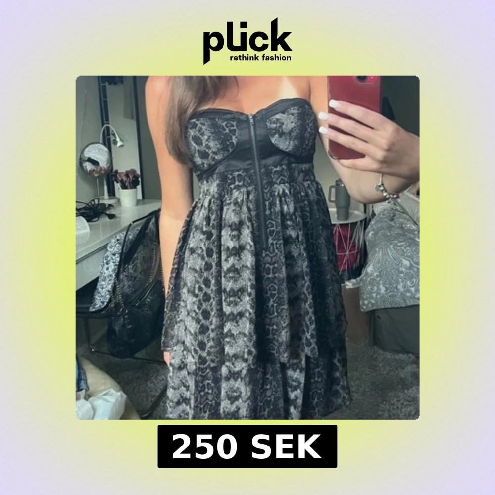 Supersnygg svart kort klänning från Amisu med ormskinnsmönster och dragkedja framtill. Axelbandslös modell med markerad byst och utställd kjol. Perfekt för dig som vill sticka ut med en edgy look. Köp via Swish + frakt (ej köp nu) eller direkt via vinted @moa.06 (pga plicks nya avgifterk) 🩷