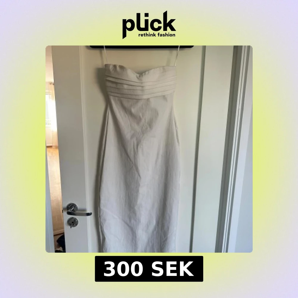 Snygg vit långklänning och stilren, veckad överdel. Klänningen har en figurnära passform och är axelbandslös upptill, vilket ger en elegant siluett. Perfekt för dig som gillar minimalistisk och klassisk stil. Den går ner till vaderna på mig som är 170. Den är utan band. Hänger på galghängarna.