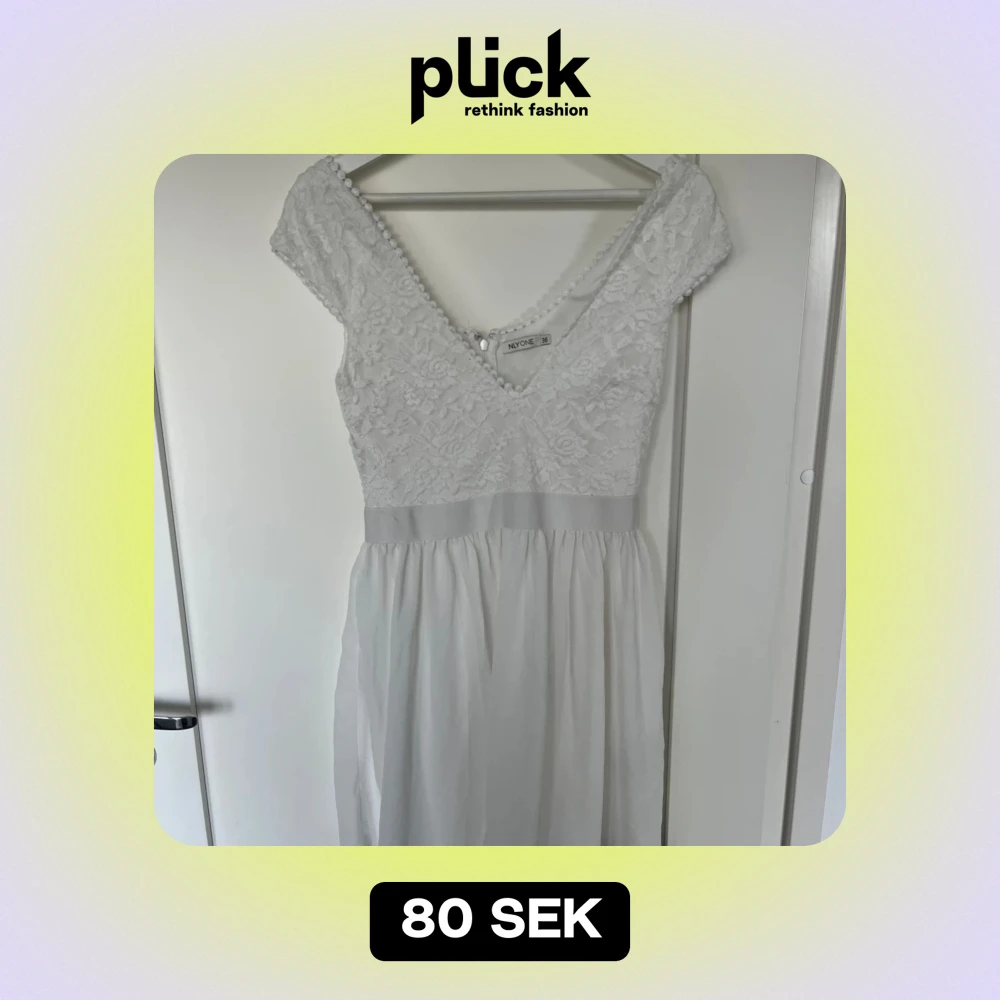 Elegant vit klänning från NLY ONE med vacker spetsdetalj på överdelen och en mjukt fallande kjol. Klänningen har en v-ringad design och korta ärmar med spets. Perfekt för sommarens fester eller studenten. Dragkedja i ryggen för enkel påklädning.