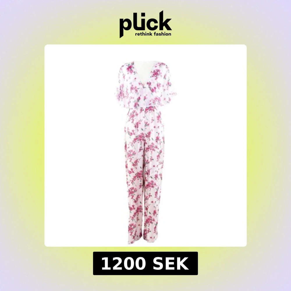 Snygg vit jumpsuit med rosa blommönster och v-ringad design. Den har långa byxben och trekvartsärmar med volangdetaljer. Perfekt för en somrig look!