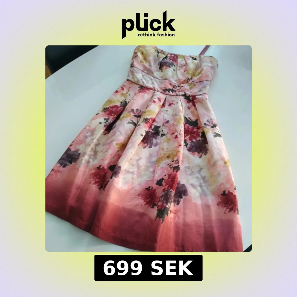 Finskt mode. En vacker axelbandslös klänning från S. T. I i SIDEN med ett blommigt mönster i rosa, lila och röda toner. Klänningen har en elegant passform och är perfekt för sommarens festligheter. 🌸
