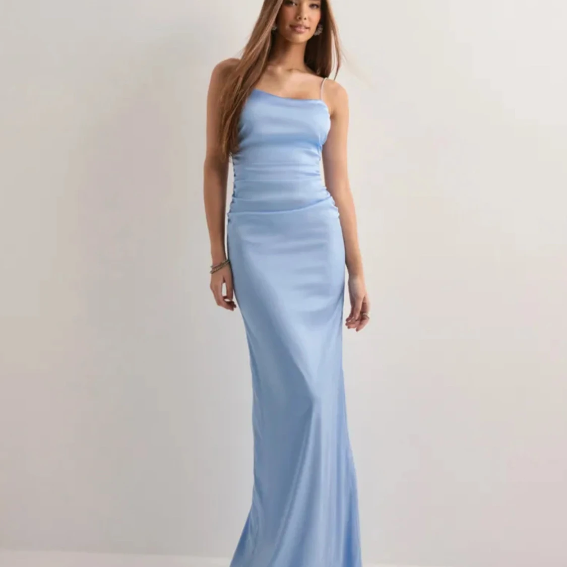 Ljusblå balklänning med smala axelband och slits. Perfekt för alla som ska på bal nu i sommar! Hör av er vid intresse🤗 Endast använd en gång, kostar 899 originalpris!