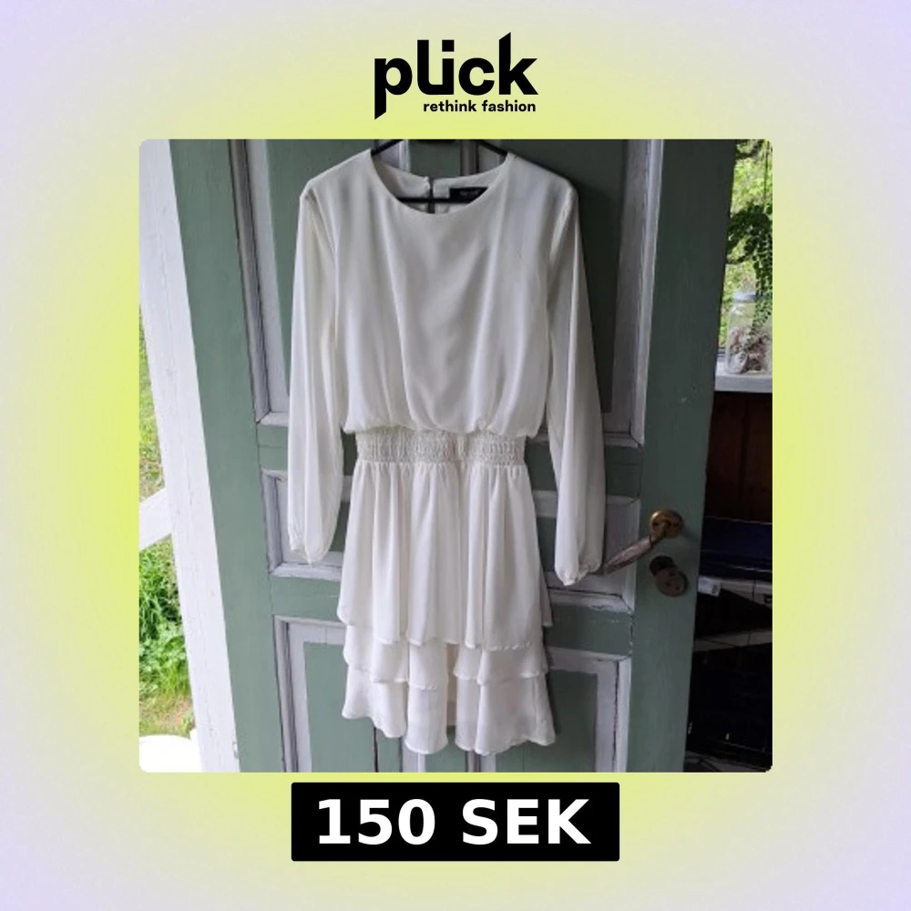 Säljer en söt vit klänning med långa ärmar och volangdetaljer i kjolen. Klänningen har resår i midjan för en bekväm passform och rund halsringning. Perfekt för sommarens tillfällen!
