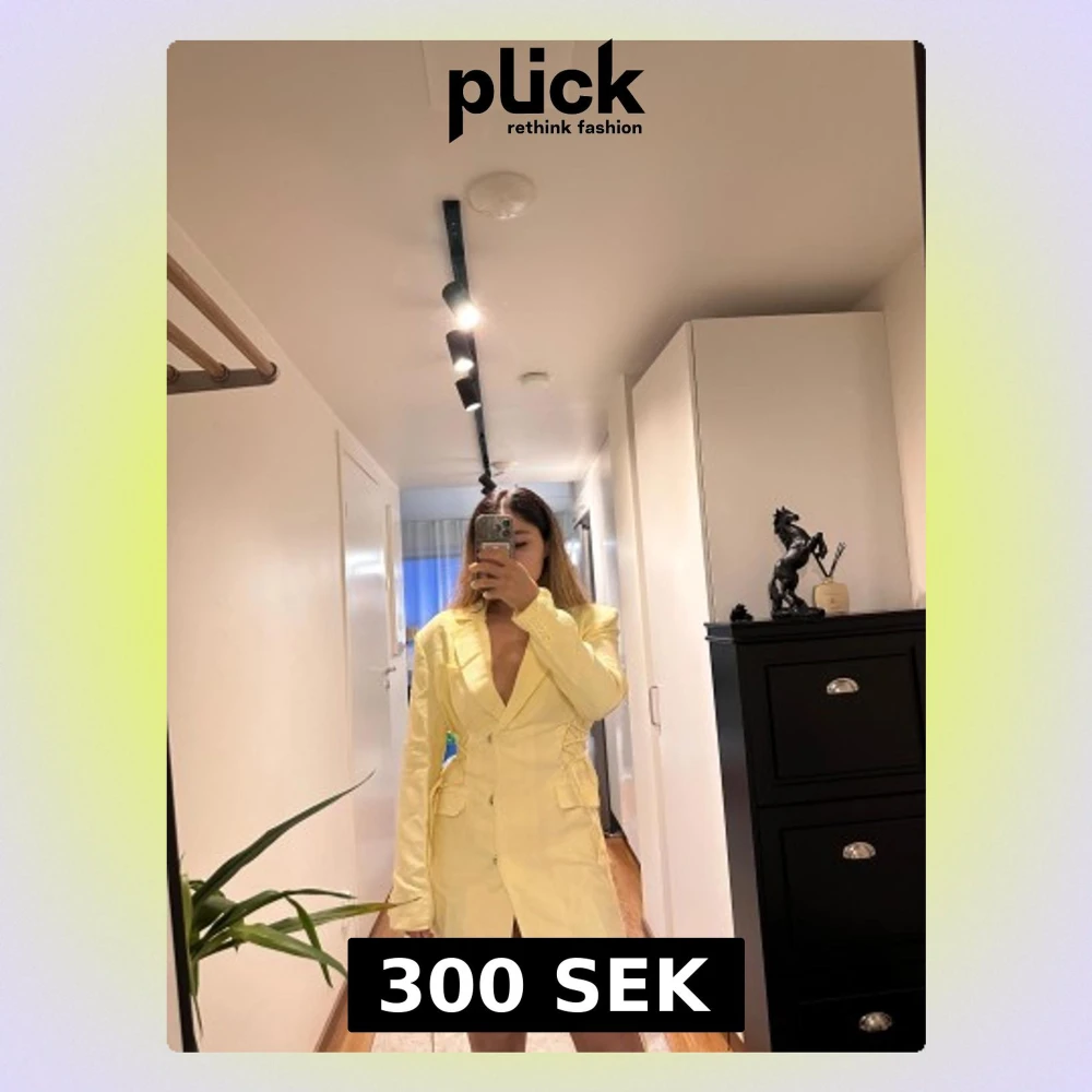 Snygg kort blazerklänning i ljusgul från Hanna Schönberg x NA-KD. Klänningen har långa ärmar, markerad krage, snörningsdetaljer i sidorna och stängs med tryckknappar. Materialet är strukturerat och känns lyxigt, perfekt för dig som vill sticka ut.