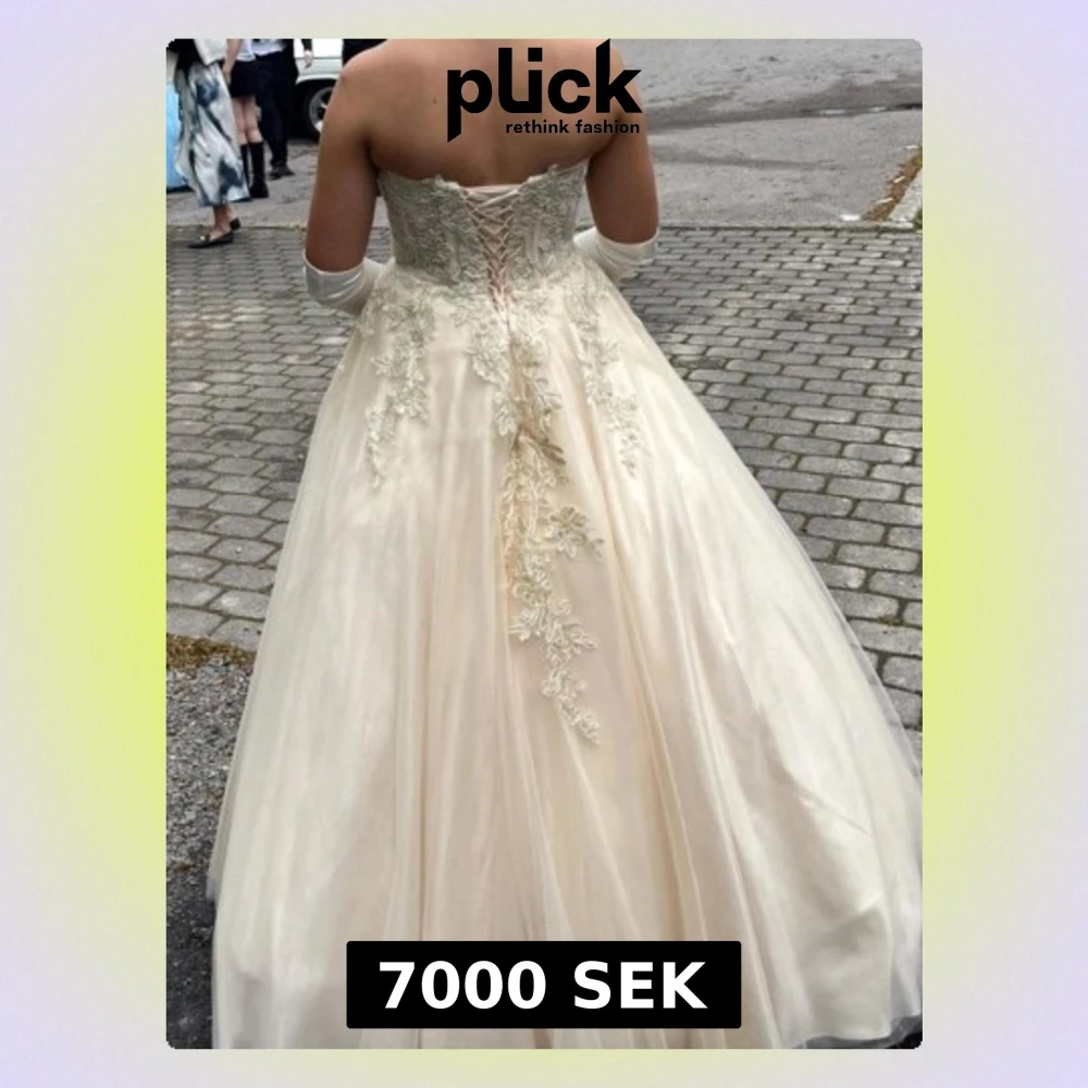 Säljer en elegant champagnefärgad lång balklänning med spetsdetaljer och snörning i ryggen. Klänningen har en axelbandslös design och ett vackert broderat liv med blommönster. Kjolen är voluminös och tillverkad i flera lager tyg som ger en lyxig känsla.