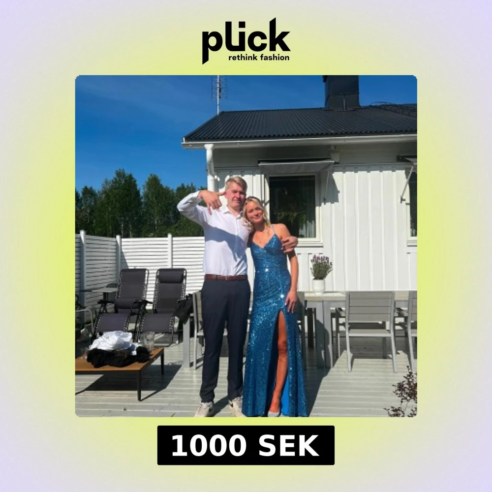 Snygg blå glittrig långklänning med smala axelband och en djup slits framtill. Klänningen har en öppen rygg med korsade band och en figurnära passform. Verkligen helt fantastisk klänning som verkligen strålade! Jag kände mig jättebekväm i den. Endast använd under en kväll på bal. Då släpade den lite i marken och blev något sliten längst ner. Det är dock inget som syns när man har den på sig. Köpt på zalando från mascara för drygt 3000kr. Jag är 173 och har 7,5 cm klackar på bilderna.