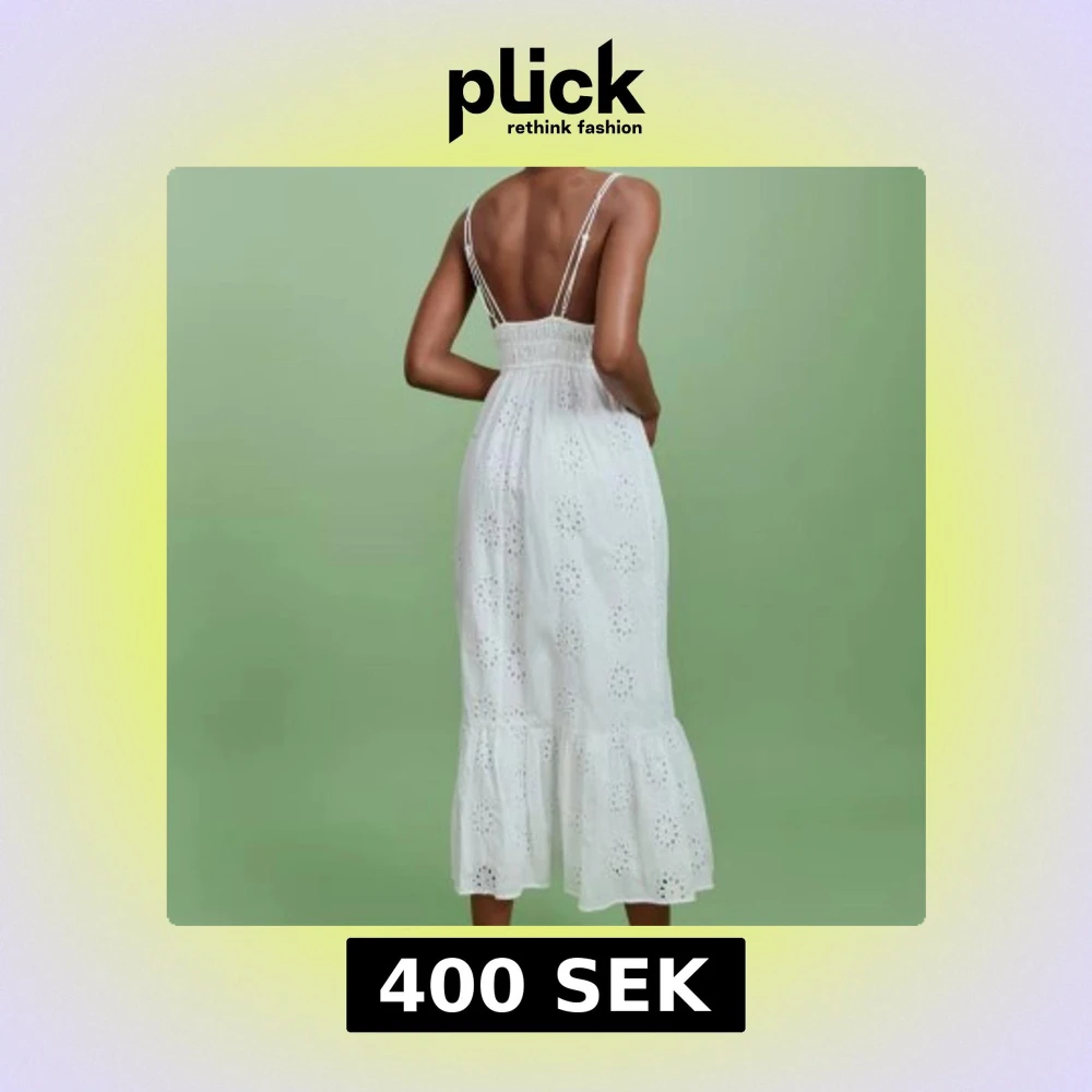 Charmig vit klänning med smala axelband och v-ringning. Klänningen har ett vackert spetsmönster och volangdetalj vid fållen. Perfekt för varma sommardagar.