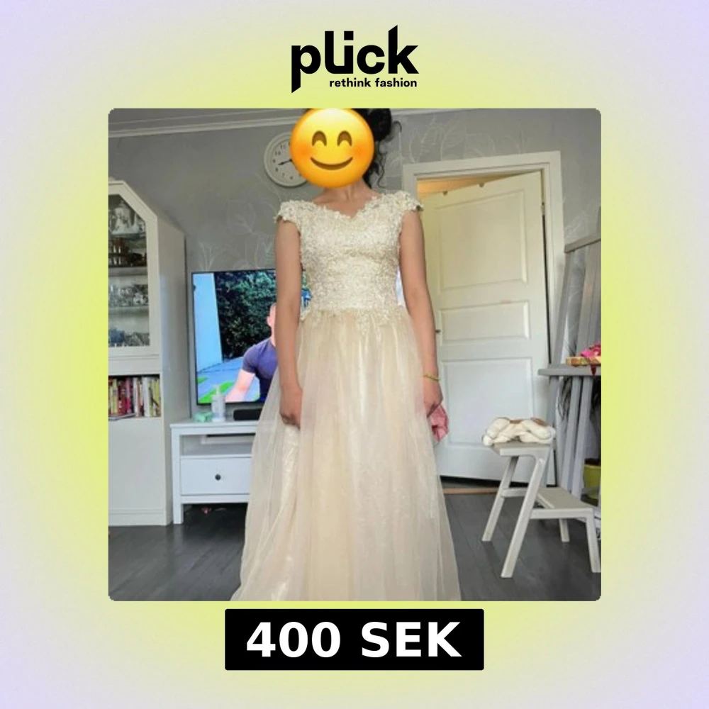 Elegant långklänning i champagnefärg med vacker spets upptill och voluminös kjol i tunt tyg. Klänningen har v-ringad hals, korta ärmar och dragkedja i ryggen. Perfekt för bal eller student. Ingen synlig logga på märket. Skulle säga den passar bra som xs och S använd 1 enda gång